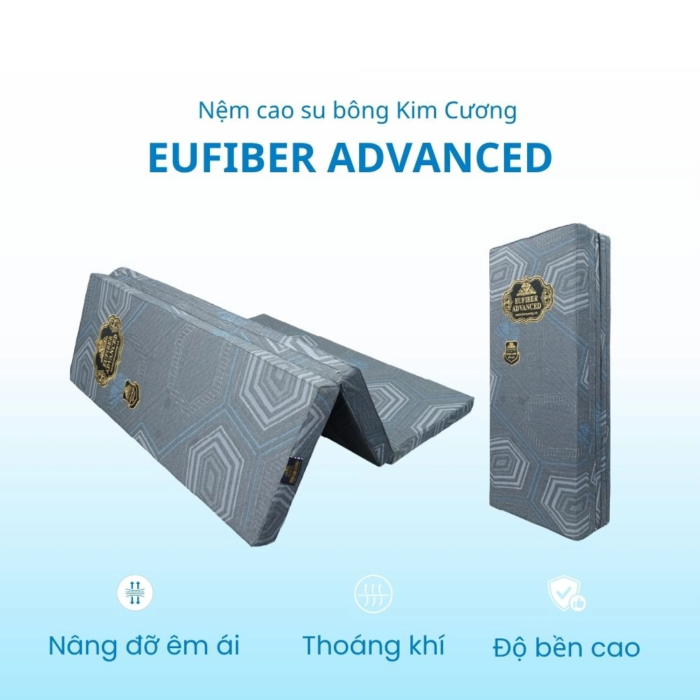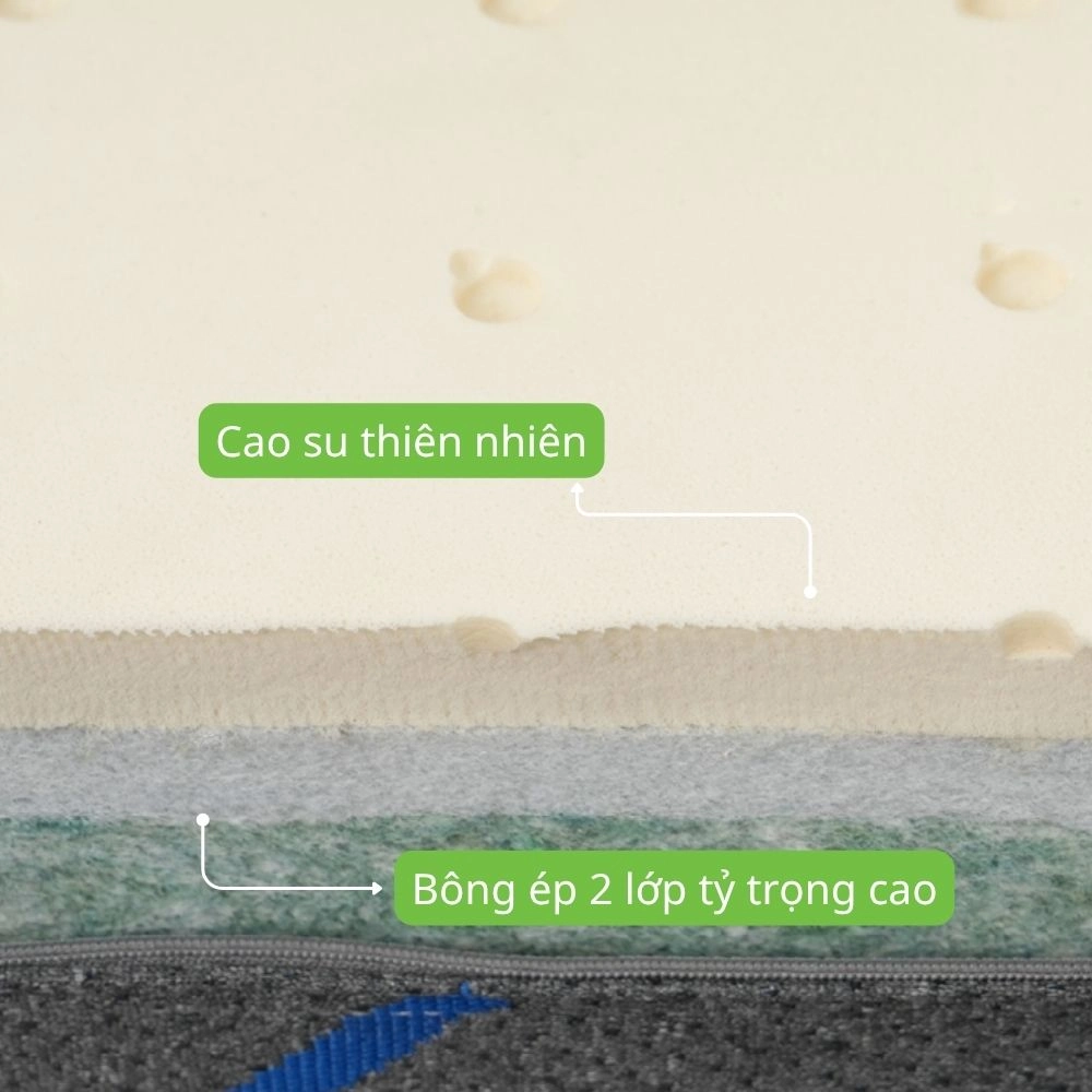 Ruột nệm: Sử dụng sợi bông Polyester tinh khiết, ép nhiệt thành khối chắc chắn, giúp nệm có độ phẳng hoàn hảo, không xẹp lún trong quá trình sử dụng. Đồng thời, bề mặt nệm phủ thêm lớp cao su thiên nhiên 100% mang lại độ êm ái, hỗ trợ giảm áp lực lên cơ thể, đặc biệt là vùng lưng và vai.