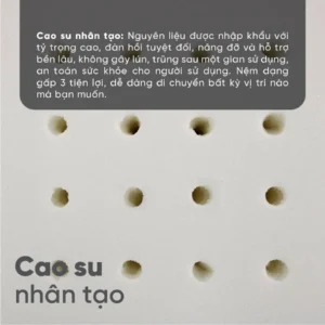 Cao su nhân tạo: Nguyên liệu được nhập khẩu 100% với tỷ trọng cao, đàn hồi tuyệt đối, nâng đỡ và hỗ trợ bền lâu, không gây lún, trũng sau một thời gian dài sử dụng, an toàn sức khỏe cho người sử dụng.