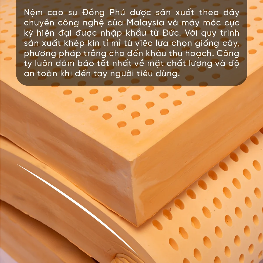Nệm cao su Đồng Phú được sản xuất theo dây chuyền công nghệ của Malaysia và máy móc cực kỳ hiện đại được nhập khẩu từ Đức. Với quy trình sản xuất khép kín tỉ mỉ từ việc lựa chọn giống cây, phương pháp trồng cho đến khâu thu hoạch. Công ty luôn đảm bảo tốt nhất về mặt chất lượng và độ an toàn khi đến tay người tiêu dùng.