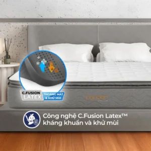 - Công nghệ C.Fusion Latex: Công nghệ dẫn truyền trực tiếp than hoạt tính vào lớp nâng đỡ cao su 100% thiên nhiên, kháng khuẩn và loại bỏ các mùi không mong muốn một cách tự nhiên.